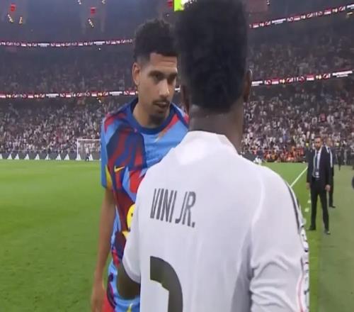 友好,西超杯中场休息时维尼修斯与阿劳霍亲切交流 -